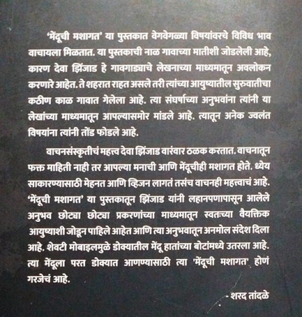 ‘मेंदूची मशागत’ या देवा झिंजाड लिखित पुस्तकात गावाशी जोडलेले अनुभव, संघर्ष आणि ज्वलंत विषय मांडले आहेत. शहरात राहत असूनही त्यांच्या लेखनाची नाळ गावाशी जोडलेली आहे. वाचनसंस्कृतीचे महत्त्व ते वारंवार अधोरेखित करतात. मेंदूच्या विकासासाठी वाचन गरजेचे असून, हे पुस्तक छोट्या प्रकरणांतून अनुभवांद्वारे मौल्यवान संदेश देते. आजचा मेंदू मोबाइलमध्ये अडकला असून, तो पुन्हा डोक्यात आणण्यासाठी अशी ‘मेंदूची मशागत’ आवश्यक आहे, असे मत शरद तांदळे यांनी व्यक्त केले. – शरद तांदळे