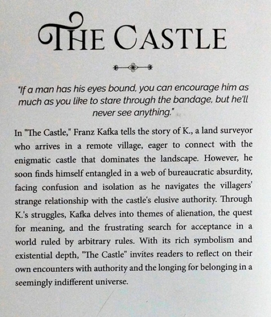 The Castle is enigmatic and polyvalent. Is it an allegory of the sprawling Austro-Hungarian Empire as it disintegrates into modern nation states, or a quasi-feudal system giving way to a new freedom for the subject? Is it the search by a central European Jew for acceptance and integration into a dominant culture? Is it a spiritual quest for grace or salvation, or an individual's struggle between his sense of independence and his need for approval? Is K. is an opportunist, a victim, or an outsider battling against an elusive authority? Is the Castle a benign source of authority or a whimsical system of control? Like K., the reader is presented with conflicting perspectives that rehearse the existential dilemmas and uncertainties of literary modernity.