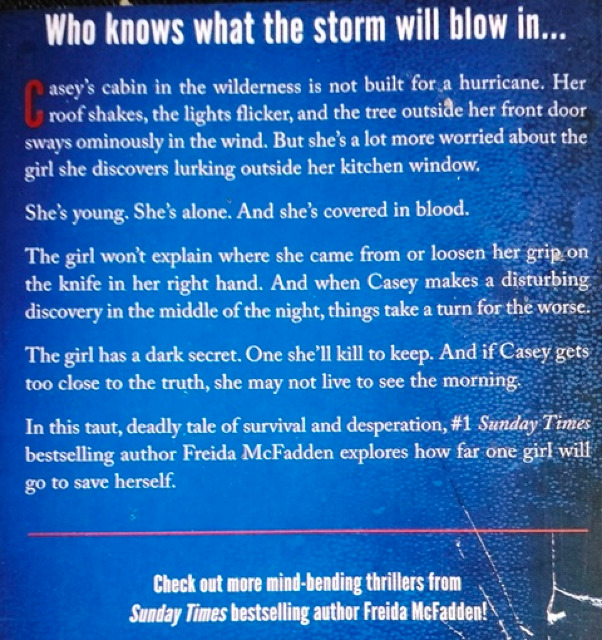Who knows what the storm will blow in… Casey's cabin in the wilderness is not built for a hurricane. Her roof shakes, the lights flicker, and the tree outside her front door sways ominously in the wind. But she's a lot more worried about the girl she discovers lurking outside her kitchen window. She’s young. She’s alone. And she’s covered in blood. The girl won't explain where she came from or loosen her grip on the knife in her right hand. And when Casey makes a disturbing discovery in the middle of the night, things take a turn for the worse. The girl has a dark secret. One she’ll kill to keep. And if Casey gets too close to the truth, she may not live to see the morning. In this taut, deadly tale of survival and desperation, bestselling author Freida McFadden explores how far one girl will go to save herself.