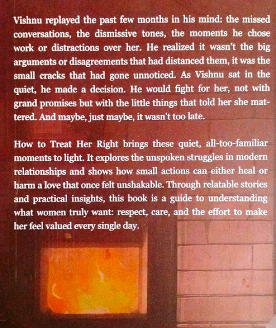 About The Book Vishnu replayed the past few months in his mind: the missed conversations, the dismissive tones, the moments he chose work or distractions over her. He realized it wasn't the big arguments or disagreements that had distanced them, and it was the small cracks that had gone unnoticed. As Vishnu sat in the quiet, he made a decision. He would fight for her, not with grand promises but with the little things that told her, she muttered. And maybe, just maybe, it wasn't too late. How to Treat Her Right brings these quiet, all-too-familiar moments to light. It explores the unspoken struggles in modern relationships and shows how small actions can either heal or harm a love that once felt unshakable. Through relatable stories and practical insights, this book guides understanding what women truly want: respect, care, and the effort to make them feel valued daily. About The Author "Gautam Grover was born and raised in the vibrant capital city of India, Delhi. From a young age, he found himself drawn to the art of writing. Gautam’s journey began with a simple habit of penning down daily quotes, which eventually evolved into his passion for storytelling. Today, he stands as the author of his third book, with many more to come in the future. Gautam is an avid traveller and nature enthusiast who finds peace and inspiration in the world around him. Whether hosting open mic events for young writers or mentoring aspiring authors for free, he believes in creating spaces for others to rise and share their voices. For Gautam, guidance should always be accessible, and helping others publish their stories with impactful content is his way of giving back to the writing community. He is very active in social work, like going to slum areas to carry out free pad donation drives for girls and women with poor backgrounds and to educate them regarding the same. Gautam also shares blogs, writing tips, and webinars to help aspiring authors ace their craft on his website. He attributes his success to his unwavering faith and the support of his family, friends and you, dear readers, who have stood by his side at every step. Their encouragement fuels his desire to write and discover more, making this endless journey of creativity truly meaningful. To connect with him - Instagram - @gautamgrover_ and Linkedin Gautam Grover".