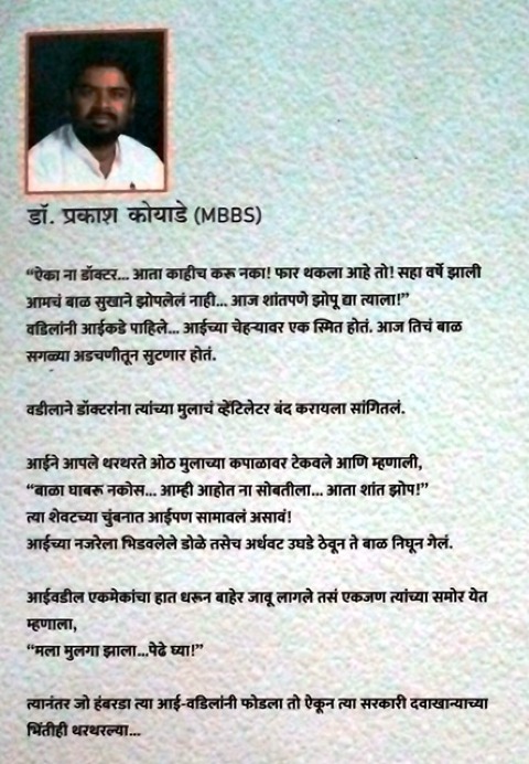 जेव्हा रुग्णासाठी पैसा संपतो, सोनं गहाण ठेवलं जातं, कधीकधी जमीन विकावी लागते तेव्हा सरकारी दवाखान्याची पायरी दिसू लागते आणि एक प्रवास सुरू होतो... मृत्यूची वाट बघण्याचा! अपघात विभागात घडणाऱ्या घटना, आयसीयूमधील आपल्या व्यक्तीचा मृत्यू, शेवटच्या क्षणी होणारी नातेवाईकांची घालमेल, पोस्टमार्टम करणाऱ्या व्यक्तीचं आयुष्य, डॉक्टर लोकांचं व्यवसायिक आणि खाजगी जीवन, डिलिव्हरी वार्ड! खूप वर्षांनंतर बाळाच्या जन्माचा आनंद... सगळंच वाईट नाही, काही चांगल्याही गोष्टी! सरकारी दवाखान्यातील लावारिस लोक, गर्दी, तिथला वास, कचराकुंडीत नाळेसहीत सापडलेलं बाळ, छातीवर 'मृत्यू' अशा नावाचा टॅटू काढणारा कर्मचारी, म्हाताऱ्यांची प्रेम कहानी, स्वतःच्या हाताने आपल्या मुलाचं व्हेंटिलेटर बंद करणारा बाप... काय नाही या कादंबरीत! हे सगळं सुरू असतानाच घडणारा वेगवान घटनाक्रम आणि दवाखान्याच्या चार भिंतींच्या नकळत घडणारे एक युद्ध! सस्पेन्स थ्रिलरने भरलेला एक फार मोठा गुन्हा... आणि त्याची उकल! एकीकडं माणूस वाचवा म्हणून प्रयत्न करणारी माणसं आणि दुसरीकडं मढ्यावरचं लोणी खाणारी माणसं! ही कादंबरी तुम्हाला जगण्याची आशा देईल, नात्यांचं महत्त्व देईल, माणसाची किंमत देईल... हसणं देईल, रडणं देईल! ही कादंबरी तुम्हाला सोडून गेलेल्या तुमच्या एकातरी माणसाची आठवण करून देईल.