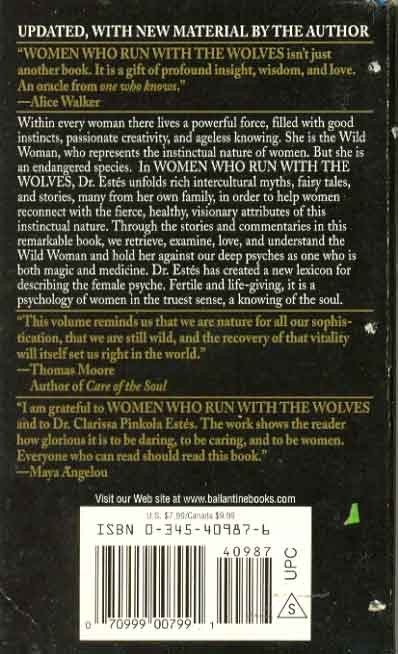 Within every woman there lives a powerful force, filled with good instincts, passionate creativity, and ageless knowing. She is the Wild Woman, who represents the instinctual nature of women. But she is an endangered species. For though the gifts of wildish nature belong to us at birth, society's attempt to "civilize" us into rigid roles has muffled the deep, life-giving messages of our own souls. In Women Who Run With the Wolves, Dr. Estes unfolds rich intercultural myths, fairy tales, and stories, many from her own family, in order to help women reconnect with the fierce, healthy, visionary attributes of this instinctual nature. Through the stories and commentaries in this remarkable book, we retrieve, examine, love, and understand the Wild Woman, and hold her against our deep psyches as one who is both magic and medicine. Dr. Estes has created a new lexicon for describing the female psyche. Fertile and life-giving, it is a psychology of women in the truest sense, a knowing of the soul
