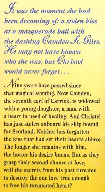 It was the moment she had been dreaming of: a stolen kiss at a masquerade ball with the dashing Camden St. Giles. He may not have known who she was, but Christel would never forget . . . Nine years have passed since that magical evening. Now Camden, the seventh earl of Carrick, is widowed with a young daughter, a man with a heart in need of healing. And Christel has just stolen onboard his ship bound for Scotland. Neither has forgotten the kiss that had set their hearts ablaze. The longer she remains with him, the hotter his desire burns. But as they grasp their second chance at love, will the secrets from his past threaten to destroy the one love true enough to free his tormented heart?