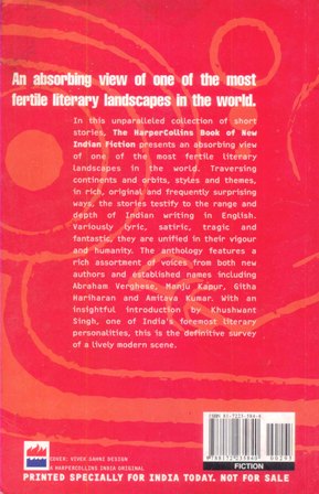New Indian Fiction : Contemporary Writing In this unparalleled collection of short stories, The HarperCollins Book of New Indian Fiction presents an absorbing view of one of the most fertile literary landscapes in the world. Traversing continents and orbits, styles and themes, in rich, original and frequently surprising ways, the stories testify to the range and depth of Indian writing in English. Variously lyric, satiric, tragic and fantastic, they are unified in their vigour and humanity. T The anthology features a rich assortment of voices from both new authors and established names including Abraham Verghese, Manju Kapur, Githa Hariharan and Amitava Kumar. With an insightful introduction by Khushwant Singh, one of India’s foremost literary personalities, this is the definitive survey of a lively modern scene.