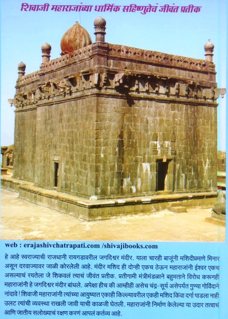 हे आहे स्वराज्याची राजधानी रायागादावारिल जगदीश्वर मंदिर. याला चारही बाजूंनी मशिदिप्रमाने मिनार असून दरवाज्यावर जाळी कोरलेली आहे. मंदिर मशीद ही दोन्ही एकच ठेउन महाराजांनी ईश्वर एक असल्याचं रयतेला जे शिकवलं त्यांचं जिवंत प्रतिक. प्रतिगामी मंत्रिमंडळाने बहुमताने विरोध करूनही महाराजांनी हे जगादिश्वर मंदिर बांधले. अपेक्षा हीच की आम्हीही असेच चंद्र-सूर्य असेपर्यंत गुण्या गोविंदाने नांदावे! शिवाजी महाराजांनी त्यांच्या आयुष्यात एकाही किल्ल्यावरील एकहि मशिद किंवा दर्गा पाडला नाही उलट त्यांची व्यवस्था जावी याची काळजी घेतली. महाराजांनी निर्माण केलेल्या या उदार तत्वाचं आणि जातीय सलोख्याचं रक्षण कारण आपलं कर्त्तव्य आहे.