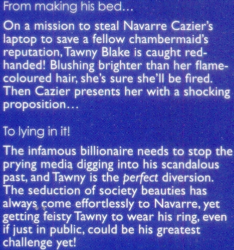 From making his bed… On a mission to steal Navarre Cazier’s laptop to save a fellow chambermaid’s reputation, Tawny Blake is caught red handed! Blushing brighter than her flame coloured hair, she’s sure she’ll be fired. Then Cazier presents her with a shocking proposition…