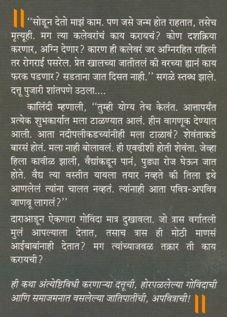 "सोडून देतो मांझ काम.पण जसे जन्म होत राहतात,तसेच मृतयुही.मग त्या कलेवरांचं काय करायचं? कोण दशक्रिया करणार,अग्नि देणार?कारण ही कलेवरं जर अग्निरहित राहिली तर रोगराई पसरेल. प्रेत खालच्या जातीतलं की वरच्या ह्यांन काय फरक पडणार? सडताना जात दिसत नाही."सगळे स्तब्ध झाले. दत्तू पुजारी शांतपणे उठला... कालिंदी म्हणाली,"तुम्ही योग्य तेच केलंत.आत्तपर्यंत प्रत्येक शुभकार्यात मला टाळण्यत आलं.हीन वागणूक देण्यात आली.आता नदी पलीकडच्यांनीही मला टाळावं? शेवंताकडे बारसं होतं.मला नाही बोलावलं.ही एवदीशी होती शेवंता.जेव्हा हीला.वैद्य त्या वस्तीत यायला तायर नव्हते की तिला इथे आणलेलं त्यांना चालत नव्हतं.त्यांनाही आता पवित्र-अपवित्र जाणवू लागलं?" दाराआडून एकणारा गोविंदा मात्र दुखावला.जो त्रास वर्गातील मुलं आपल्याला देतात,तसाच त्रास ही मोठी माणसं आईबाबांनाही देतात? मग तयांचजवळ तक्रार ती काय करायची?