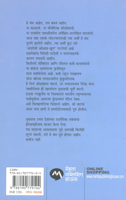 हे बंध आहेत, पण बंधनं नाहीत. ना काळाची, ना भौगोलिक परिसीमांची, ना राजकीय पातळीवरील अपेक्षित-अनपेक्षित बदलांची. आज सहा दशकं लोटल्यानंतरही ज्या अर्थी हे बंध पुराणे झालेले नाहीत, त्या अर्थी कुठं तरी 'अंतरीची ओळख-खूण' पटलेली आहे. एकमेकांना विदेशी-परदेशी न मानण्याइतके आपण जवळचे आहोत. कितीतरी सोव्हिएत आणि रशियन कवी-कलावंतांनी या बंधांना आपापल्या कृतींमधून साज चढविलेला आहे. कवी रसूल गमझातव यांना स्त्रीच्या ललाटावरील कुंकुमतिलक हे तिचं ओळखपत्र वाटतं, तर स्व्यातस्लाव रेरिख यांना लक्ष्मीदेवता ही महन्मंगल सृजनाची मूर्ती वाटते. इल्या ग्लझुनोव या चित्रकारानं भारतीय राष्ट्रध्वजाच्या पाश्र्वभूमीवर आपल्या कुंचल्यानं पंडित नेहरू असे विलक्षणरित्या चितारले आहेत, की वाटावं आत्ता याच क्षणी ते हस्तांदोलनासाठी पुढं होतील. नुकताच उभय देशांच्या राजनौतिक संबंधांचा हीरकमहोत्सव साजरा केला गेला. त्या साठाच्या आकड्यावर पुढे आणखी कितीही शून्यं चढली, तरी हे बंध जुने होणार नाहीत. कधीच नाही.