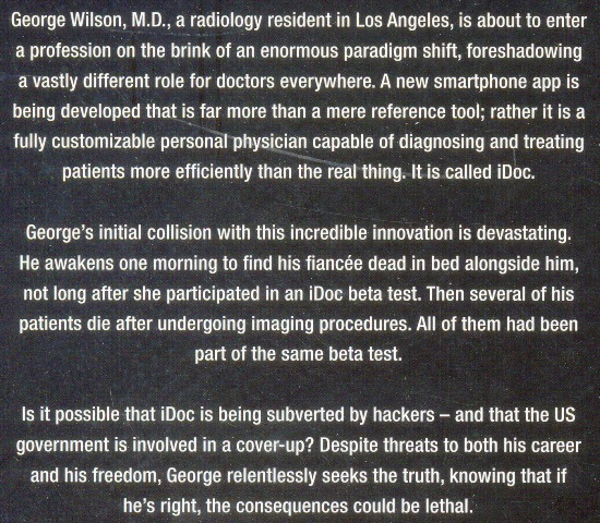 George Wilson, M.D. a radiology resident in Los Angeles, is about to enter a profession on the brink of an enormous paradigm shift, foreshadowing a vastly different role for doctors everywhere. The smartphone is poised to take on a new role in medicine, no longer as a mere medical app but rather as a fully customizable personal physician capable of diagnosing and treating even better than the real thing. It is called iDoc. Georges initial collision with this incredible innovation is devastating. He awakens one morning to find his fiancee dead in bed alongside him, not long after she participated in an iDoc beta test. Then several of his patients die after undergoing imaging procedures. All of them had been part of the same beta test. Is it possible that iDoc is being subverted by hackers and that the US government is involved in a cover up? Despite threats to both his career and his freedom, George relentlessly seeks the truth, knowing that if hes right, the consequences could be lethal. The author returns with a top notch fusion of ground breaking medical science and edge-of-your-seat suspense.