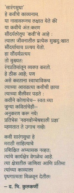'सारंगसुधा' हे कवीचे काव्यनाम. या नावावरूनच लक्षात येते कि या कवीचे अंत:करण सौंदर्यलोलुप 'कवी'चे आहे : त्याला जीवनातील प्रत्येक सुखदु:खात सौंदर्याचाच प्रत्यय येतो. हा सौंदर्यप्रत्यय तो मुख्यतः रंगप्रतिमांतून व्यक्त करतो. हे ठीक आहे; पण असे करताना स्वाभाविकच त्याच्या आवडत्या कवीची छाया त्याच्या शैलीवर पडते : कवीने कोणाचेच - स्वतःच्या जुन्या कवितांचेही- अनुकरण करू नये! प्रतिभेस नवनवोन्मषशाली प्रज्ञा' म्हणतात ते उगाचच नव्हे! कवी सारंगसुधा हे मराठी साहित्याचे प्रशिक्षित अभ्यासक नव्हत; त्यांचे कार्यक्षेत्र वेगळेच आहे. त्या क्षेत्रातील जाणीव आणि प्रतिमा त्यांच्या काव्याला पृथात्मता मिळउन देतील!