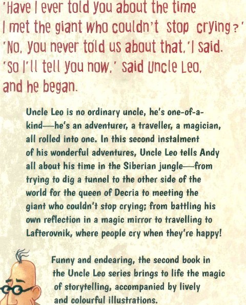 Have I ever told you about the time I met the giant who couldnt stop crying? No, you never told us about that, I said. So Ill tell you now, said Uncle Leo and he began. Uncle Leo is no ordinary uncle, hes one-of-a-kind - hes an adventurer, a traveller, a magician, all rolled into one. In this second instalment of his wonderful adventures, Uncle Leo tells Andy all about his time in the Siberian jungles - from digging a tunnel to the other side of the world for the queen of Decria to meeting the giant who couldnt stop crying from battling his own reflection in a magic mirror to travelling to Lafterovnik, where people cry when theyre happy! Funny and endearing, the second book in the Uncle Leo series brings to life the magic of storytelling, accompanied by lively and colourful illustrations. Interesting Facts The Uncle Leos Adventures series brings together lucid writing, endearing characters and magical plots into one grand adventure. Seeped in fantasy, these books emphasize the power of storytelling and encourage children to read and think, for themselves. Beautifully illustrated by award-winning Israeli artist Yaniv Shimony and faithfully translated by Margo Eyon, the Uncle Leos Adventures series will delight all readers, both young and old alike.