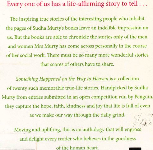 The inspiring true stories of the interesting people who inhabit the pages of Sudha Murtys books leave an indelible impression on us. But the books are able to chronicle the stories of only the men and women Mrs. Murty has actually come across herself in the course of her social work. There must be so many more wonderful stories that many others have to share. Something Happened on the Way to Heaven is a collection of twenty such memorable true life stories. Handpicked by Sudha Murty from a contest run by Penguin, they capture the hope, faith, kindness and joy that life is full of, even as we make our way through the daily grind. Moving and uplifting, this is an anthology that will engross and delight every reader who believes in the goodness of the human heart. About the Editor Sudha Murty was born in 1950 in Shiggaon in north Karnataka. She did her MTech in computer science and is now the chairperson of the Infosys Foundation. A prolific writer in English and Kannada, she has written novels, technical books, travelogues, collections of short stories and non-fictional pieces and four books for children. Her books have been translated into all the major Indian languages. Sudha Murty was the recipient of 'The R. K. Narayan Award for Literature' and 'The Padma Shri' in 2006 and 'The Attimabbe Award' from the government of Karnataka for excellence in Kannada literature in 2011.