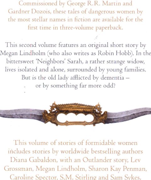 Commissioned by George R. R. Martin and Gardner Dozois, these tales of dangerous women by the most stellar names in fiction are available for the first time in a three volume paperback set. This second volume features an original short story by Megan Lindholm (Who also writes as Robin Hobb). In the bittersweet neighbors Sarah, a rather strange widow, lives isolated and alone, surrounded by young families. But is the old lady afflicted by dementia-or by something far more odd?