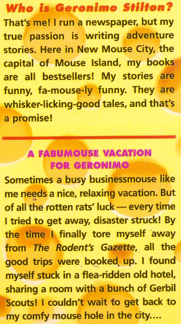 Every busy mouse needs some time to go off and relax on a nice soothing vacation. But, Geronimo Stilton isn’t just any old busy mouse. Just when he thinks he can look forward to a few calm days of rest and relaxation, something happens. His office gets flooded, his printing press breaks down, and if that wasn’t enough, his aunt Dizzy Fur’s beautiful little mouse hole burns down! But, to make matters worse, not only did he not get the vacation that he wanted, but he finds out that it happens to be vacation season and everything has already been booked. In the end, he gets stuck in a filthy little hotel which has a severe flea problem, and worse still, he has to share rooms with a troop of Gerbil Scouts! Geronimo Stilton is the average, successful business mouse. He lives a comfortable life in New Mouse City and is a journalist and editor for The Rodent’s Gazette. He spends his time in the calm of his home and office, but when crime and danger rear their ugly heads, there is only one mouse in all of New Mouse City that everyone turns to, Geronimo Stilton. This highly popular children’s series has over 50 issues completed and has been translated into over 35 languages. Originally written in Italian, the series is also extremely popular in its English translation.