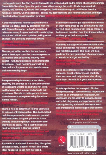 Dream with Your Eyes Open brings you the inspirational entrepreneurial story of Ronnie Screwvala, the first-generation entrepreneur and founder of UTV. It hopes to demystify victory, inspire victory, uplift ambitions and help you think big. Summary of the Book This title details the entrepreneur’s vast experiences and the numerous lessons learnt from over twenty years of building some successful (and a few not-so-successful) businesses, bringing more clarity to an ever-changing business landscape and presenting an ardent account on the role of entrepreneurship in India's future. It shares thoughts and anecdotes to help you gain better insights into entrepreneurship and give you a fighting chance when it comes to making your dreams come true. About Ronnie Screwvala Rohinton Soli "Ronnie" Screwvala is an Indian first-generation entrepreneur and philanthropist. He was the Founder-CEO of the UTV Group. He was the Managing Director of Disney-UTV India, Managing Trustee of the Swades Foundation and Founder & Advisor at Unilazer Ventures Ltd. Screwvala has been named in the Esquire's List of the 75 Most Influential People of the 21st Century. He ranked 78 among the 100 most influential people in the world list by Time 100. He was also one of the 25 Asia’s Most Powerful by Fortune magazine and was called the Jack Warner of India by Newsweek. Ernst & Young named him the Entrepreneur of the Year.