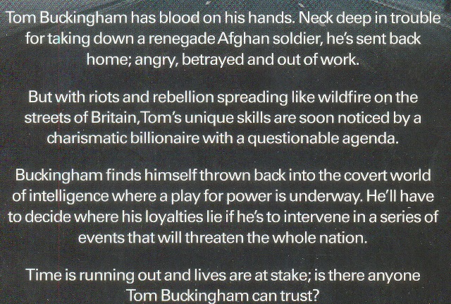 Tom Buchingham has blood on his hands. Neck deep in troble for taking doen a renegade Afghan soldier, he's sent back home: angry, betrayed and out of work. But with riots and rebellion spreading like wildfire on the streets of Britain, Tom's unique skills are soon noticed by a charismatic billionaire with a questionable agenda. Buchkingham finds himself thrown back into the covert world of intelligence where a play for power is underway. He'll have to decide where his loyalties lie if he's tp intervene in a series of events that will threaten the whole nation Time is running out and lives are at stake; is there anyone Tom can trust?