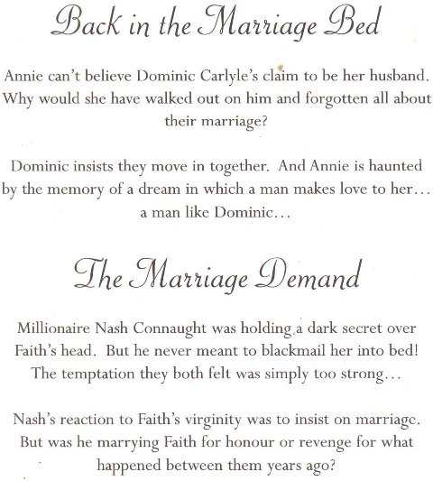 1.) Back in the Marriage Bed Annie can’t believe Dominic Carlyle’s claim to be her husband. Why would she have walked out on him and forgotten all about their marriage? Dominic insists they move in together. And Annie is haunted by the memory of a dream in which a man makes love to her… a man like Dominic… 2.) The Marriage Demand Millionaire Nash Connaught was holding a dark secret over Faith’s head. But he never meant to blackmail her into bed! The temptation they both felt was simply too strong… Nash’s reaction to Faith’s virginity was to insist on marriage. But was he marrying Faith for honour or revenge for what happened between them years ago?