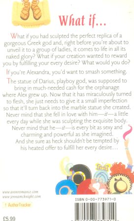 What if you had sculpted the perfect replica of a gorgeous Greek god and, right before you're about to unveil it to a group of ladies, it comes to life in all its naked glory? What if your creation wanted to reward you by fulfilling your every desire? What would you do? If you're Alexandra, you'd want to smash something. The statue of Darius, playboy god, was supposed to bring in much-needed cash for the orphanage where Alex grew up. Now that it has miraculously turned to flesh, she just needs to give it a small imperfection so that it'll turn back into the marble statue she created.Never mind that she fell in love with him -- it -- a little every day while she was sculpting the exquisite body. Never mind that he -- it -- is every bit as sexy and charming and powerful as she imagined.And she sure as heck shouldn't be tempted by his heated offer to fulfill her every desire...
