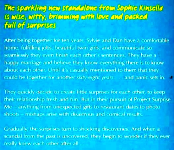 After being together for ten years, Sylvie and Dan have a comfortable home, fulfilling jobs, beautiful twin girls and communicate so seamlessly, they finish each other's sentences. They have a happy marriage and believe they know everything there is to know about each other. Until it's casually mentioned to them that they could be together for another sixty-eight years and panic sets in. They quickly decide to create little surprises for each other, to keep their relationship fresh and fun. But in their pursuit of Project Surprise Me - anything from unexpected gifts to restaurant dates to photo shoots - mishaps arise with disastrous and comical results. Gradually, the surprises turn to shocking discoveries. and when a scandal from the past is uncovered, they begin to wonder if they ever really knew each other after all. Everybody loves Sophie Kinsella: 'Left me giddy with laughter. I loved it' Jojo Moyes 'One of the most relatable books I've read in a long time, I couldn’t put it down.' Louise Pentland (Sprinkle of Glitter) 'Life doesn't get much better than a new Sophie Kinsella novel' Red.