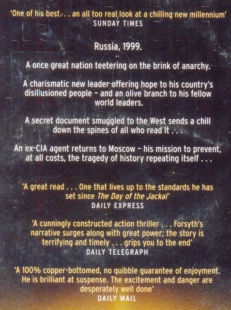 It is 1999 and Russia is on the edge of total implosion. Social and moral order has collapsed and what small semblance of control there is, is being imposed by mafia-like criminal gangs. While public opinion in the West is largely indifferent, the political analysts are less sanguine - Russian meltdown will make the disintegration of the Balkans look like the collapse of a cup-cake. Out of the chaos, however, a single charismatic voice is starting to be heard - that of Igor Komarov, a visionary patriot who claims he can restore Russia's greatness and bring prosperity to the masses. He even woos Western political leaders with a rather more realistic analysis of the way forward for Russia. Komarov is set to win the next election when a document is smuggled into the British Embassy in Moscow. It's called The Black Manifesto and it appears to show Komarov's secret agenda - his political blueprint is really Mein Kampf, the rebirth of Russia will be as a New Third Reich with Komarov as Fuhrer. But can the document be authenticated? And what can the Western Alliance's most secret Trilateral Commission do about it if it is? They need to find another voice the masses will listen to and obey rather than Komarov - an icon they can cleave to and trust. Once, not that long ago, he was called the Tsar. And so develops a thrilling and increasingly frightening adventure - Jason Monk, ex-CIA, who used to run agents into the Soviet Union, is recruited and slips back into Russia, into the desperate Moscow world of poverty, luxury, gangsters and prostitutes and underneath it all, the titanic power struggle to ensure the outcome of the forthcoming elections.