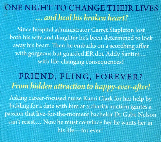 One night to change their lives …and heal his broken heart? Since hospital administrator garret stapleton lost both his wife and daughter he’s been determined to lock away his heart. Then he embarks on a scorching affair with gorgeous but guarded er doc Addy santini…with life-changing consequences! Friend, fling, forever? From hidden attraction to happy-ever-after! Asking career-focused nurse kami Clark for her help by bidding for a date with him at a charity auction ignites a passion that live-for-the-moment Bachelor Dr Gabe Nelson can’t resist… now he must convince her he wants her in his life—for ever!.