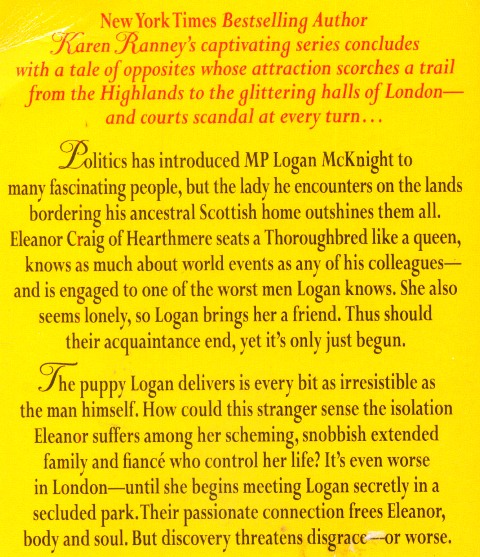 New York Times Bestselling Author Karen Ranney’s captivating series concludes with a tale of opposites whose attraction scorches a trail from the Highlands to the glittering halls of London—and courts scandal at every turn . . . Politics has introduced MP Logan McKnight to many fascinating people, but the lady he encounters on the lands bordering his ancestral Scottish home outshines them all. Eleanor Craig of Hearthmere seats a Thoroughbred like a queen, knows as much about world events as any of his colleagues—and is engaged to one of the worst men Logan knows. She also seems lonely, so Logan brings her a friend. Thus should their acquaintance end, yet it’s only just begun. The puppy Logan delivers is every bit as irresistible as the man himself. How could this stranger sense the isolation Eleanor suffers among her scheming, snobbish extended family and fiancé who control her life? It’s even worse in London—until she begins meeting Logan secretly in a secluded park. Their passionate connection frees Eleanor, body and soul. But discovery threatens disgrace—or worse.