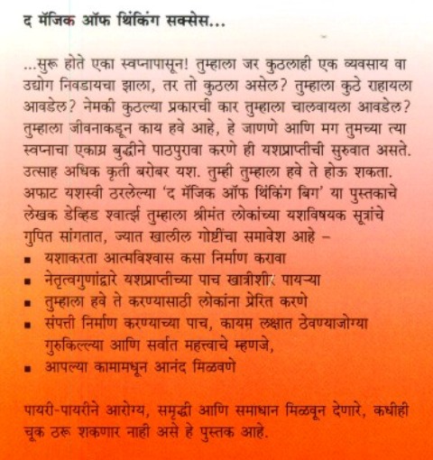 द मॅजिक ऑफ थिंकिंग सक्सेस हे पुस्तक एका स्वप्नापासून सुरू होते. तुम्हाला आयुष्यात काय हवे आहे, या प्रश्नापासून सुरू होणारा हा प्रवास ते साध्य करण्याच्या विविध पातळ्यांपर्यंत येऊन पोचतो. आरोग्य, संपत्ती आणि समाधान मिळवण्याच्या संगतवार पायऱ्यांचा हा खरा मार्गदर्शक आहे. जो हमखास यशप्राप्तीची खात्री देतो.
