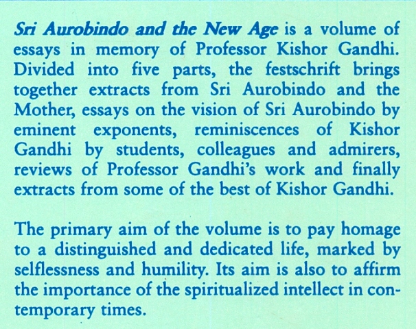 'Sri Aurobindo and the New Age' is a volume of essays in memory of Professor Kishor Gandhi. Divided into five parts, the festschrift brings together extracts from Sri Aurobindo and the Mother, essays on the vision of Sri Aurobindo by eminent exponents, reminiscences of Kishor Gandhi by students, colleagues and admirers, reviews of Professor Gandhi's work and finally extracts from some of the best of Kishor Gandhi.