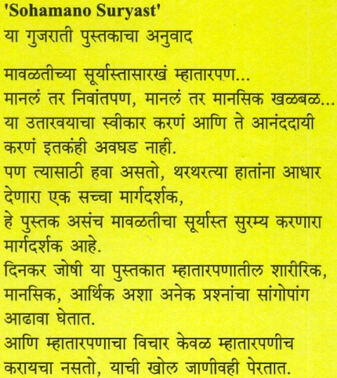 मावळतीच्या सूर्योस्तासारखं म्हातारपण... मानलं तर निवांतपण, मानलं तर मानसिक खळबळ... या उतारवयाचा स्वीकार करणं आणि ते आनंददायी करणं इतकंही अवघड नाही. पण त्यासाठी हवा असतो, थरथरत्या हातांना आधार देणारा एक सच्चा मार्गदर्शक, हे पुस्तक असंच मावळतीचा सूर्यास्त सूरम्य करणारा मार्गदर्शक आहे.दिनकर जोषी या पुस्तकात म्हातारपणातील शारीरिक, मानसिक, आर्थिक अशा अनेक प्रश्नांचा सांगोपांग आढावा घेतात. आणि म्हातारपणाचा विचार केवळ म्हातारपणीच का नसतो, याची खोल जाणीवही पेरतात.