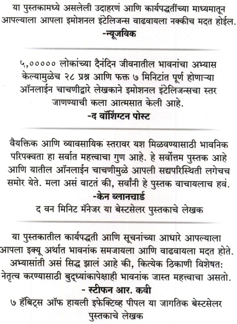 рднрд╛рд╡рдирд╛ рдХрд╢рд╛ рд╣рд╛рддрд╛рд│рд╛рд╡реНрдпрд╛рдд рдЖрдгрд┐ рдмреБрджреНрдзрд┐рдорддреНрддреЗрдЪрд╛ рдкреНрд░рднрд╛рд╡реАрдкрдгреЗ рдЙрдкрдпреЛрдЧ рдХрд╕рд╛ рдХрд░рд╛рд╡рд╛ рдпрд╛рдмрджреНрджрд▓ рд╕рд╡рд┐рд╕реНрддрд░рдкрдгреЗ рд╕рд╛рдВрдЧрдгрд╛рд░реЗ рдкреБрд╕реНрддрдХ - рджрд▓рд╛рдИ рд▓рд╛рдорд╛ рдЬрдЧрдкреНрд░рд╕рд┐рджреНрдз рдЗрдореЛрд╢рдирд▓ рдЗрдВрдЯреЗрд▓рд┐рдЬрдиреНрд╕ рдЪрд╛рдЪрдгреАрд╕рд╣ рдпрд╛ рдкреБрд╕реНрддрдХрд╛рдордзреНрдпреЗ рдЕрд╕рд▓реЗрд▓реА рдЙрджрд╛рд╣рд░рдгрдВ рдЖрдгрд┐ рдХрд╛рд░реНрдпрдкрджреНрдзрддреАрдВрдЪреНрдпрд╛ рдорд╛рдзреНрдпрдорд╛рддреВрди рдЖрдкрд▓реНрдпрд╛рд▓рд╛ рдЖрдкрд▓рд╛ рдЗрдореЛрд╢рдирд▓ рдЗрдВрдЯреЗрд▓рд┐рдЬрдиреНрд╕ рд╡рд╛рдврд╡рд╛рдпрд▓рд╛ рдирдХреНрдХреАрдЪ рдорджрдд рд╣реЛрдИрд▓. -рдиреНрдпреВрдЬрд╡рд┐рдХ 5,00000 рд▓реЛреЗрдХрд╛рдВрдЪреНрдпрд╛ рджреИрдирдВрджрд┐рди рдЬреАрд╡рдирд╛рддреАрд▓ рднрд╛рд╡рдирд╛рдВрдЪрд╛ рдЕрднреНрдпрд╛рд╕ рдХреЗрд▓реНрдпрд╛рдореБрд│реЗрдЪ 28 рдкреНрд░рд╢реНрди рдЖрдгрд┐ рдлрдХреНрдд 7 рдорд┐рдирд┐рдЯрд╛рдВрдд рдкреВрд░реНрдг рд╣реЛрдгрд╛рд░реНтАНрдпрд╛ рдСрдирд▓рд╛рдИрди рдЪрд╛рдЪрдгреАрджреНрд╡рд╛рд░реЗ рд▓реЗрдЦрдХрд╛рдиреЗ рдЗрдореЛрд╢рдирд▓ рдЗрдВрдЯреЗрд▓рд┐рдЬрдиреНрд╕рдЪрд╛ рд╕реНрддрд░ рдЬрд╛рдгрдгреНрдпрд╛рдЪреА рдХрд▓рд╛ рдЖрддреНрдорд╕рд╛рдд рдХреЗрд▓реА рдЖрд╣реЗ. -рдж рд╡реЙрд╢рд┐рдВрдЧреНрдЯрди рдкреЛрд╕реНрдЯ рд╡реИрдпрдХреНрддрд┐рдХ рдЖрдгрд┐ рд╡реНрдпрд╛рд╡рд╕рд╛рдпрд┐рдХ рд╕реНрддрд░рд╛рд╡рд░ рдпрд╢ рдорд┐рд│рд╡рдгреНрдпрд╛рд╕рд╛рдареА рднрд╛рд╡рдирд┐рдХ рдкрд░рд┐рдкрдХреНрд╡рддрд╛ рд╣рд╛ рд╕рд░реНрд╡рд╛рдд рдорд╣рддреНрддреНрд╡рд╛рдЪрд╛ рдЧреБрдг рдЖрд╣реЗ. рд╣реЗ рд╕рд░реНрд╡реЛрддреНрддрдо рдкреБрд╕реНрддрдХ рдЖрд╣реЗ рдЖрдгрд┐ рдпрд╛рддреАрд▓ рдСрдирд▓рд╛рдИрди рдЪрд╛рдЪрдгреАрдореБрд│реЗ рдЖрдкрд▓реА рд╕рджреНрдпрдкрд░рд┐рд╕реНрдерд┐рддреА рд▓рдЧреЗрдЪрдЪ рд╕рдореЛрд░ рдпреЗрддреЗ. рдорд▓рд╛ рдЕрд╕рдВ рд╡рд╛рдЯрддрдВ рдХреА, рд╕рд░реНрд╡рд╛рдВрдиреА рд╣реЗ рдкреБрд╕реНрддрдХ рд╡рд╛рдЪрд╛рдпрд▓рд╛рдЪ рд╣рд╡рдВ. -рдХреЗрди рдмреНрд▓рд╛рдирдЪрд╛рд░реНрдб рдж рд╡рди рдорд┐рдирд┐рдЯ рдореЕрдиреЗрдЬрд░ рдпрд╛ рдмреЗрд╕реНрдЯрд╕реЗрд▓рд░ рдкреБрд╕реНрддрдХрд╛рдЪреЗ рд▓реЗрдЦрдХ рдпрд╛ рдкреБрд╕реНрддрдХрд╛рддреАрд▓ рдХрд╛рд░реНрдпрдкрджреНрдзрддреА рдЖрдгрд┐ рд╕реВрдЪрдирд╛рдВрдЪреНрдпрд╛ рдЖрдзрд╛рд░реЗ рдЖрдкрд▓реНрдпрд╛рд▓рд╛ рдЖрдкрд▓рд╛ рдЗрдХреНрдпреВ рдЕрд░реНрдерд╛рдд рднрд╛рд╡рдирд╛рдВрдХ рд╕рдордЬрд╛рдпрд▓рд╛ рдЖрдгрд┐ рд╡рд╛рдврд╡рд╛рдпрд▓рд╛ рдорджрдд рд╣реЛрддреЗ. рдЕрднреНрдпрд╛рд╕рд╛рдВрддреА рдЕрд╕рдВ рд╕рд┐рджреНрдз рдЭрд╛рд▓рдВ рдЖрд╣реЗ рдХреА, рдХрд┐рддреНрдпреЗрдХ рдард┐рдХрд╛рдгреА рд╡рд┐рд╢реЗрд╖рдд: рдиреЗрддреГрддреНрд╡ рдХрд░рдгреНрдпрд╛рд╕рд╛рдареА рдмреБрджреНрдзреНрдпрд╛рдВрдХрд╛рдкреЗрдХреНрд╖рд╛рд╣реА рднрд╛рд╡рдирд╛рдВрдХ рдЬрд╛рд╕реНрдд рдорд╣рддреНрддреНрд╡рд╛рдЪрд╛ рдЕрд╕рддреЛ. - рд╕реНрдЯреАрдлрди рдЖрд░. рдХрд╡реА 7 рд╣реЕрдмрд┐рдЯреНрд╕ рдСрдл рд╣рд╛рдпрд▓реА рдЗрдлреЗрдХреНрдЯрд┐рд╡реНрд╣ рдкреАрдкрд▓ рдпрд╛ рдЬрд╛рдЧрддрд┐рдХ рдмреЗрд╕реНр