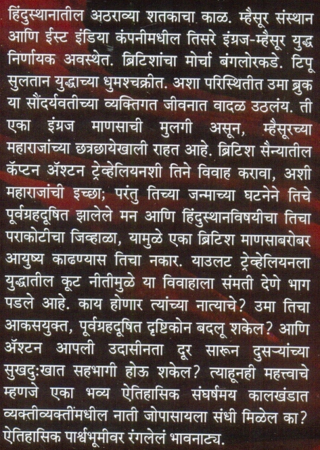 म्हैसूरचे संस्थानिक महाराज. उमा ही त्यांच्या मृत बहिणीची आणि वॉरेन या ब्रिटिश सैनिकाची मुलगी. म्हैसूरच्या किल्ल्याला वेढा घालून बसलेला इंग्रज सैन्यातील देखणा ब्रिटिश तरुण अॅश्टन एका नाट्यमय प्रसंगामुळे महाराजांच्या तावडीत सापडतो. ते त्याच्यासमोर उमाशी विवाह करण्याचा प्रस्ताव ठेवतात. उमाच्या मनात ब्रिटिशांविषयी द्वेष आणि अॅश्टनलाही विवाहबंधनात अडकायचं नसतानाही त्यांचा विवाह होतो. अॅश्टनशी झालेला विवाह हा उमाच्या जीवनातील नावडता, तरी महत्त्वाचा अध्याय आहे. तर दुसर्या बाजूला उमाकडे असलेल्या एका वस्तूमुळे (ज्या वस्तूबद्दल ती स्वत: अनभिज्ञ आहे) तिच्यावर हल्ल्याचे, तिच्या अपहरणाचे प्रयत्न होत आहेत. उमा आणि अॅश्टनचं वैवाहिक जीवन फुलतं का, तिच्याजवळ असलेल्या वस्तूचा शोध तिला लागतो का आणि ती वस्तू कुणाला आणि का हवी असते, याचं काय रहस्य असतं? ऐतिहासिक पार्श्वभूमीवर फुललेली एक हळुवार, रहस्यमय प्रेमकहाणी.