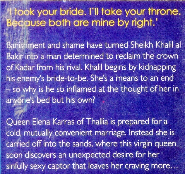 ‘I took your bride. I’ll take your throne. Because both are mine by right.’ Banishment and shame have turned Sheikh Khalil al Bakir into a man determined to reclaim the crown of Kadar from his rival. Khalil begins by kidnapping his enemy’s bride-to-be. She’s a means to an end – so why is he so inflamed at the thought of her in anyone’s bed but his own? Queen Elena Karras of Thallia is prepared for a cold, mutually convenient marriage. Instead she is carried off into the sands, where this virgin queen soon discovers an unexpected desire for her sinfully sexy captor that leaves her craving more…