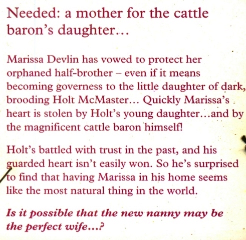 Needed: a mother for the cattle baron's daughter...Marissa Devlin has vowed to protect her orphaned half-brother - even if it means becoming governess to the little daughter of dark, brooding Holt McMaster...Quickly Marissa's heart is stolen by Holt's young daughter...and by the magnificent cattle baron himself!Holt's battled with trust in the past, and his guarded heart isn't easily won. So he's surprised to find that having Marissa in his home seems like the most natural thing in the world.Is it possible that the new nanny may be the perfect wife...?