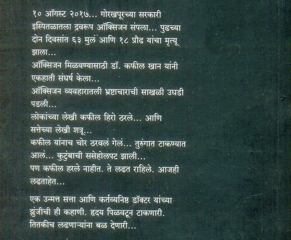 १० ऑगस्ट २०१७... गोरखपूरच्या सरकारी इस्पितळातला द्रवरूप ऑसिजन संपला... पुढच्या दोन दिवसांत ६३ मुलं आणि १८ प्रौढ यांचा मृत्यू झाला... ऑसिजन मिळवण्यासाठी डॉ. कफील खान यांनी एकहाती संघर्ष केला... ऑसिजन व्यवहारातली भ्रष्टाचाराची साखळी उघडी पडली... लोकांच्या लेखी कफील हिरो ठरले... आणि सत्तेच्या लेखी शत्रू... कफील यांनाच चोर ठरवलं गेलं... तुरुंगात टाकण्यात आलं... कुटुंबाची ससेहोलपट झाली... पण कफील हरले नाहीत. ते लढत राहिले. आजही लढताहेत... एक उन्मत्त सत्ता आणि कर्तव्यनिष्ठ डॉटर यांच्या झुंजीची ही कहाणी. हृदय पिळवटून टाकणारी. तितकीच लढणार्यांना बळ देणारी... द गोरखपूर हॉस्पिटल ट्रॅजेडी डॉ. कफील खान । अनुवाद : राजेंद्र साठे