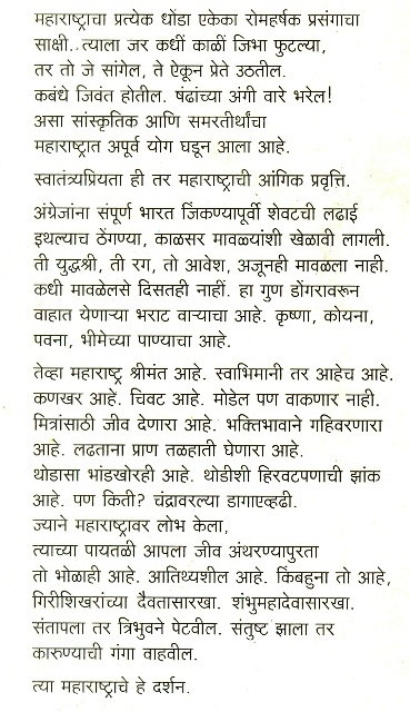рдЕрдВрдЧреНрд░реЗрдЬрд╛рдВрдирд╛ рд╕рдВрдкреВрд░реНрдг рднрд╛рд░рдд рдЬрд┐рдВрдХрдгреНрдпрд╛рдкреВрд░реНрд╡реА рд╢реЗрд╡рдЯрдЪреА рд▓рдврд╛рдИ рдЗрдерд▓реНрдпрд╛рдЪ рдареЗрдВрдЧрдгреНрдпрд╛, рдХрд╛рд│рд╕рд░ рдорд╛рд╡рд│реНрдпрд╛рдВрд╢реА рдЦреЗрд│рд╛рд╡реА рд▓рд╛рдЧрд▓реА. рддреА рдпреБрдзреНрджрд╢реНрд░реА рддреА рд░рдЧ, рддреЛ рдЖрд╡реЗрд╢, рдЕрдЬреВрдирд╣реА рдорд╛рд╡рд│рд▓рд╛ рдирд╛рд╣реА. рдХрдзреА рдорд╛рд╡рд│реЗрд▓рд╕реЗ рджрд┐рд╕рдд рдирд╛рд╣реА. рд╣рд╛ рдЧреБрдг рдбреЛрдВрдЧрд░рд╛рд╡рд░реВрди рд╡рд╛рд╣рд╛рдд рдпреЗрдгрд╛рд░реНтАНрдпрд╛ рднрд░рд╛рдЯ рд╡рд╛рд░реНтАНрдпрд╛рдЪрд╛ рдЖрд╣реЗ. рдХреГрд╖реНрдгрд╛, рдХреЛрдпрдирд╛,рдкрд╡рдирд╛, рднреАрдореЗрдЪреНрдпрд╛ рдкрд╛рдгреНрдпрд╛рдЪрд╛ рдЖрд╣реЗ. рддреЗрд╡реНрд╣рд╛ рдорд╣рд╛рд░рд╛рд╖реНрдЯреНрд░ рд╢реНрд░реАрдордВрдд рдЖрд╣реЗ. рд╕реНрд╡рд╛рднрд┐рдорд╛рдиреА рддрд░ рдЖрд╣реЗрдЪ рдЖрд╣реЗ. рдХрдгрдЦрд░ рдЖрд╣реЗ, рдЪрд┐рд╡рдЯ рдЖрд╣реЗ. рдореЛрдбреЗрд▓ рдкрдг рд╡рд╛рдХрдгрд╛рд░ рдирд╛рд╣реА. рдорд┐рддреНрд░рд╛рдВрд╕рд╛рдареА рдЬреАрд╡ рджреЗрдгрд╛рд░рд╛ рдЖрд╣реЗ. рднрдХреНрддрд┐рднрд╛рд╡рд╛рдиреЗ рдЧрд╣рд┐рд╡рд░рдгрд╛рд░рд╛ рдЖрд╣реЗ. рд▓рдврддрд╛рдирд╛ рдкреНрд░рд╛рдг рддрд│рд╣рд╛рддреА рдШреЗрдгрд╛рд░рд╛ рдЖрд╣реЗ. рдереЛрдбрд╛рд╕рд╛ рднрд╛рдВрдбрдЦреЛрд░рд╣реА рдЖрд╣реЗ. рдереЛрдбреАрд╢реА рд╣рд┐рд░рд╡рдЯрдкрдгрд╛рдЪреА рдЭрд╛рдВрдХ рдЖрд╣реЗ. рдкрдг рдХрд┐рддреА? рдЪрдВрджреНрд░рд╛рд╡рд░рд▓реНрдпрд╛ рдбрд╛рдЧрд╛рдПрд╡реНрд╣рдвреА. рдЬреНрдпрд╛рдиреЗ рдорд╣рд╛рд░рд╛рд╖реНрдЯреНрд░рд╛рд╡рд░ рд▓реЛрдн рдХреЗрд▓рд╛, рддреНрдпрд╛рдЪреНрдпрд╛ рдкрд╛рдпрддрд│реА рдЖрдкрд▓рд╛ рдЬреАрд╡ рдЕрдВрдерд░рдгреНрдпрд╛рдкреБрд░рддрд╛ рддреЛ рднреЛрд│рд╛рд╣реА рдЖрд╣реЗ. рдЖрддрд┐рдереНрдпрд╢реАрд▓ рдЖрд╣реЗ. рдХрд┐рдВрдмрд╣реБрдирд╛ рддреЛ рдЖрд╣реЗ рдЧрд┐рд░рд┐рд╢рд┐рдЦрд░рд╛рдВрдЪреНрдпрд╛ рджреИрд╡рддрд╛рд╕рд╛рд░рдЦрд╛, рд╢рдВрднреБрдорд╣рд╛рджреЗрд╡рд╛рд╕рд╛рд░рдЦрд╛. рд╕рдВрддрд╛рдкрд▓рд╛ рддрд░ рддреНрд░рд┐рднреБрд╡рди рдкреЗрдЯрд╡реАрд▓. рд╕рдВрддреБрд╖реНрдЯ рдЭрд╛рд▓рд╛ рддрд░ рдХрд╛рд░реВрдгреНрдпрд╛рдЪреА рдЧрдВрдЧрд╛ рд╡рд╛рд╣рд╡реАрд▓. рддреНрдпрд╛ рдорд╣рд╛рд░рд╛рд╖реНрдЯреНрд░рд╛рдЪреЗ рд╣реЗ рджрд░реНрд╢рди