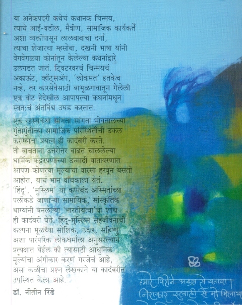 या अनेकपदरी कथेचं कथानक चिन्मय, त्याचे आई-वडील, मैत्रीण, सामाजिक कार्यकर्ते अशा व्यक्तीपासून लालबाबाचा दर्गा, त्याचा शेजारचा म्हसोबा, दखनी भाषा यांनी वेगवेगळ्या कोनांतून केलेल्या कथनांद्वारे उलगडत जातं. ट्विटरवरचं चिन्मयचं अकाऊंट, व्हॉट्सअॅप, ‘लोकमत’ इतकेच नव्हे, तर कारसेवेसाठी बाभूळगावातून गेलेली एक वीट हेदेखील आपापल्या कथनांमधून स्वतःचं अंतर्विश्व उघड करतात. एक रहस्यकथा सांगता सांगता भोवतालच्या गुंतागुंतीच्या सामाजिक परिस्थितीची उकल करण्याचा प्रयत्न ही कादंबरी करते. ती वाचताना उत्तरोत्तर वाढत चाललेल्या धार्मिक कट्टरपणाच्या उन्मादी वातावरणात आपण कोणत्या मूल्यांचा वारसा हरवून बसतो आहोत, याचं भान वाचकाला येतं.. ‘हिंदू’, ‘मुस्लिम’ या कप्पेबंद अस्मितांच्या पलीकडे जाणाऱ्या सामायिक, सांस्कृतिक धाग्यांनी बनलेल्या ‘भारतीयत्वा’ चा शोध ही कादंबरी घेते. हिंदू-मुस्लिम सहजीवनाची कल्पना मूळच्या सोशिक, उदार, सहिष्णु अशा पारंपरिक लोकधर्माला अनुसरल्याने प्रत्यक्षात येईल की त्यासाठी आधुनिक मूल्यांचा अंगीकार करणं गरजेचं आहे, असा कळीचा प्रश्न लेखकाने या कादंबरीत उपस्थित केला आहे.