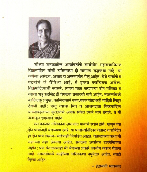 рдЪреМрдереНрдпрд╛ рд╢рддрдХрд╛рддреАрд▓ рдЖрд░реНрдпрд╛рд╡рд░реНрддрд╛рдЪреЗ рд╕рд╛рд░реНрд╡рднреМрдо рдорд╣рд╛рд░рд╛рдЬрд╛рдзрд┐рд░рд╛рдЬ рд╡рд┐рдХреНрд░рдорд╛рджрд┐рддреНрдп рдпрд╛рдВрдЪреА рдЪрд░рд┐рддреНрд░рдЧрд╛рдерд╛ рд╣реА рд╕рд╛рдорд╛рдиреНрдп рдпреБрджреНрдзрдХрдерд╛ рдирд╡реНрд╣реЗ. рдпрд╛ рдХрдереЗрд▓рд╛ рдЕрд╕рдВрдЦреНрдп, рдЕрдЪрд╛рдЯ рд╡ рдЕрдХрд▓реНрдкрдиреАрдп рдкреИрд▓реВ рдЖрд╣реЗрдд. рдпреЗрдереЗ рдкрд╛рддреНрд░рд╛рдВрдЪреЗ рд╡ рдШрдЯрдирд╛рдВрдЪреЗ рдЬреЗ рд╡реИрд╡рд┐рдзреНрдп рдЖрд╣реЗ, рддреЗ рдЗрддрд░рддреНрд░ рдХреНрд╡рдЪрд┐рддрдЪ рдЕрд╕реЗрд▓. рд╡рд┐рдХреНрд░рдорд╛рджрд┐рддреНрдпрд╛рдЪреА рдирд╡рд░рддреНрдиреЗ, рддреНрдпрд╛рд▓рд╛ рдорджрдд рдХрд░рдгрд╛рд▒реНрдпрд╛ рджреЛрди рдЧрдгрд┐рдХрд╛ рд╡ рддреНрдпрд╛рдЪрд╛ рд╢рддреНрд░реВ рд░реБрджреНрд░рд╕рд┐рдВрд╣ рд╣реА рд╡реЗрдЧрд│реНрдпрд╛ рдкреНрд░рдХрд╛рд░рдЪреА рдкрд╛рддреНрд░реЗ рдЖрд╣реЗрдд. рдирд╡рд░рддреНрдирд╛рдВрдордзреНрдпреЗ рдХрд╛рд▓рд┐рджрд╛рд╕ рдкреНрд░рдореБрдЦ. рдХрд╛рд▓рд┐рджрд╛рд╕рд╛рдиреЗ рд╕реНрд╡рддрдГрдмрджреНрджрд▓ рдмреЛрдЯрднрд░рд╣реА рдорд╛рд╣рд┐рддреА рд▓рд┐рд╣реВрди рдареЗрд╡рд▓реА рдирд╛рд╣реА; рдкрд░рдВрддреБ рддреНрдпрд╛рдЪрд╛ рдорд┐рддреНрд░ рд╡ рдЖрд╢реНрд░рдпрджрд╛рддрд╛ рд╡рд┐рдХреНрд░рдорд╛рджрд┐рддреНрдп рдпрд╛рдЪреНрдпрд╛рдмрджреНрджрд▓рдЪреНрдпрд╛ рдХреГрддрдЬреНрдЮрддреЗрдЪреЗ рдЕрдиреЗрдХ рд╕рдВрдХреЗрдд рддреНрдпрд╛рдиреЗ рдорд╛рдЧреЗ рдареЗрд╡рд▓реЗ. рддреЗ рдореА рдЙрд▓рдЧрдбреВрди рджрд╛рдЦрд╡рд▓реЗ рдЖрд╣реЗрдд. рддреНрдпрд╛ рдХрд╛рд│рд╛рдд рдЧрдгрд┐рдХрд╛рдВрдирд╛ рд╕рдорд╛рдЬрд╛рдд рдорд╛рдирд╛рдЪреЗ рд╕реНрдерд╛рди рд╣реЛрддреЗ. рдореНрд╣рдгреВрди рддреНрдпрд╛ рджреЛрди рдкрд╛рддреНрд░рд╛рдВрдирд╛рд╣реА рд╡реЗрдЧрд│рдкрдг рдЖрд╣реЗ. рдпрд╛ рдкрд╛рддреНрд░рд╛рдВрд╡реНрдпрддрд┐рд░рд┐рдХреНрдд рд╡реЗрддрд╛рд│ рд╡ рд╢рдирд┐рджреЗрд╡ рд╣реА рджреЛрди рдкрд╛рддреНрд░реЗ рд╡рд┐рдХреНрд░рдо-рдЪрд░рд┐рддреНрд░рд╛рд╢реА рдирд┐рдЧрдбрд┐рдд рдЖрд╣реЗрдд. рд╡реЗрддрд╛рд│рд╛рдЪреНрдпрд╛ рдХрдерд╛ рдореА рдЬрд╢рд╛рдЪреНрдпрд╛ рддрд╢рд╛ рдареЗрд╡рд▓реНрдпрд╛ рдЖрд╣реЗрдд. рд╕рдЧрд│реНрдпрд╛ рдЕрд░реНрдерд╛рддрдЪ рдЙрд▓реНрд▓реЗрдЦрд┐рд▓реНрдпрд╛ рдирд╛рд╣реАрдд; рдкрдг рд╡реЗрддрд╛рд│рд╛рдЪрд╛рд╣реА рдореА рд╡реЗрдЧрд│реНрдпрд╛ рдкреНрд░рдХрд╛рд░реЗ рдЙрдкрдпреЛрдЧ рдХрд░реВрди рдШреЗрддрд▓рд╛ рдЖрд╣реЗ. рдирд╡рд░рддреНрдирд╛рдВрдордзреНрдпреЗ рдХрд╛рд╣реАрдВрдЪреНрдпрд╛ рдЪрд░рд┐рддреНрд░рдХрдерд╛ рдирдореБрдиреЗрджрд╛рд░ рдЖрд╣реЗрдд. рддреНрдпрд╛рд╣реА рджрд┐рд▓реНрдпрд╛ рдЖрд╣реЗрдд. - рдЗрдВрджреНрд░рд╛рдпрдгреА рд╕рд╛рд╡рдХрд╛рд░