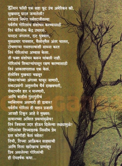 डायाना फॉसी एका सहा फूट उंच अमेरिकन स्त्री. सुखवस्तू घरात जन्मलेली! रवांडात विरुंगा पर्वतराजीतल्या पर्वतीय गोरिलांचं संशोधन करण्यासाठी तिनं कॅरिसोक केंद्र उभारलं. घनदाट जंगलात, दाट धुक्यात, मुसळधार पावसात, मैलोन्मैल अंतर चालत, टोचणाऱ्या गवतपात्यांशी सामना करत तिनं गोरिलांचा अभ्यास केला. ती फक्त संशोधन करून थांबली नाही. गोरिलांचं शिकाऱ्यांपासून रक्षण करण्यासाठी तिनं आकाशपाताळ एक केलं. हॅलोविन मुखवटा चढवून शिकाऱ्यांच्या अंगावर धावून जाणारी, संकटप्रसंगी अतुलनीय धैर्य दाखवणारी, शेवटपर्यंत हार न मानणारी, आणि काहीसं गुंतागुंतीचं व्यक्तिमत्त्व असणारी ही डायान पर्वतीय गोरिला ही महान प्रजाती आजही टिकून आहे ते मुख्यत: डायनच्या अविरत प्रयत्नांमुळेच! तिनं जिवावर उदार होऊन दिलेल्या लढ्यामुळे! गोरिलांवर तिच्याइतकं निस्सीम प्रेम इतर कोणीही केलं नसेल! तिची, तिच्या आफ्रिकन साहसाची आणि तिला खरोखरच प्राणांहून प्रिय असलेल्या गोरिलांची ही रोमहर्षक कथा... Nyiramachabelli Dian Fossey : Ruta Ranade निरामशाबेली डायान फॉसी । ऋता रानडे