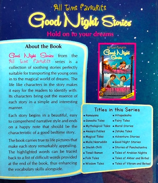 Good Night Stories from the All time favorite series is a collection of soothing stories perfectly suitable for transporting the young ones in to the magical world of dreams. The life like characters in the story makes it easy for the readers to identify with. Its characters bring out the essence of each story in a simple and interesting manner. Each story begins in a beautiful, easy to comprehend narrative style and ends on a happy note that should be the characteristic of a good bedtime story. The book carries true to life pictures that make each story remarkable appealing. The highlighted words can be traced back to a list of difficult words provided at the end of the book, thus enhancing the vocabulary skills alongside
