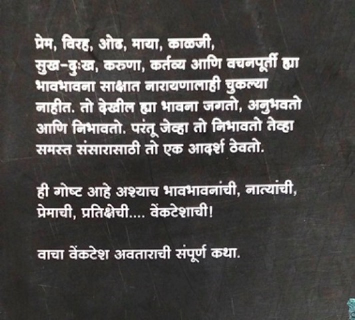 प्रेम, विरह, ओढ, माया, काळजी, सुख-दुःख, करुणा, कर्तव्य आणि वचनपूर्ती ह्या भावभावना साक्षात नारायणालाही चुकल्या नाहीत. तो देखील ह्या भावना जगतो, अनुभवतो आणि निभावतो. परंतू जेव्हा तो निभावतो तेव्हा समस्त संसारासाठी तो एक आदर्श ठेवतो. ही गोष्ट आहे अश्याच भावभावनांची, नात्यांची, प्रेमाची, प्रतिक्षेची…. वेंकटेशाची ! वाचा वेंकटेश अवताराची संपूर्ण कथा.