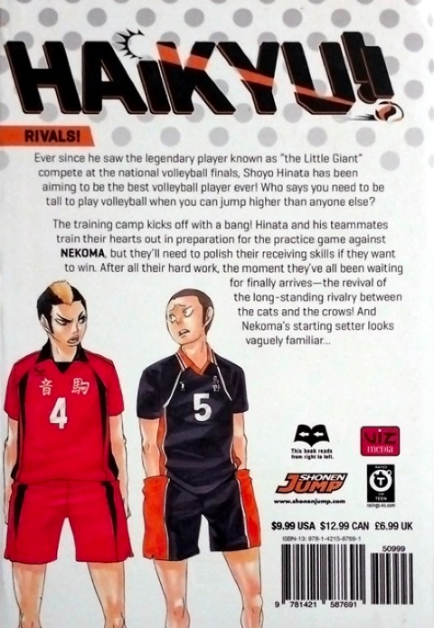 Shoyo Hinata is out to prove that in volleyball you don't need to be tall to fly!Ever since he saw the legendary player known as “the Little Giant” compete at the national volleyball finals, Shoyo Hinata has been aiming to be the best volleyball player ever! Who says you need to be tall to play volleyball when you can jump higher than anyone else?The training camp kicks off with a bang! Hinata and his teammates train their hearts out in preparation for the practice game against Nekoma, but they’ll need to polish their receiving skills if they want to win. After all their hard work, the moment they’ve all been waiting for finally arrives—the revival of the long-standing rivalry between the Cats and the Crows! And Nekoma’s starting setter looks vaguely familiar…