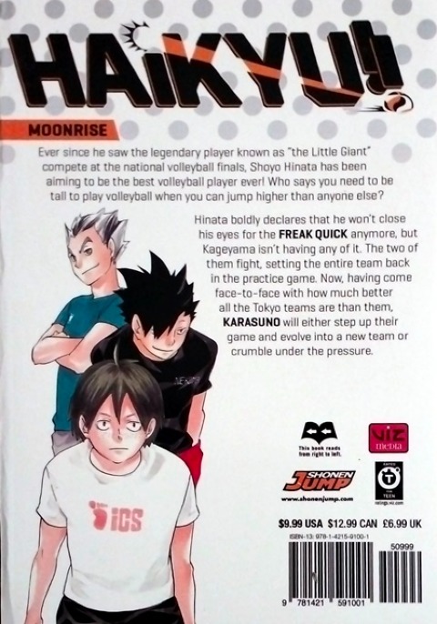 Shoyo Hinata is out to prove that in volleyball you don't need to be tall to fly!Ever since he saw the legendary player known as “the Little Giant” compete at the national volleyball finals, Shoyo Hinata has been aiming to be the best volleyball player ever! Who says you need to be tall to play volleyball when you can jump higher than anyone else?Hinata boldly declares that he won’t close his eyes for the freak quick anymore, but Kageyama isn’t having any of it. The two of them fight, setting the entire team back in the practice game. Now, having come face-to-face with how much better all the Tokyo teams are than them, Karasuno will either step up their game and evolve into a new team or crumble under the pressure.