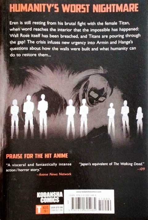 HUMANITY'S WORST NIGHTMARE Eren is still resting from his brutal fight with the female Titan, when word reaches the interior that the impossible has happened: Wall Rose itself has been breached, and Titans are pouring through the gap! The emergency casts new urgency over Armin and Hange's questions about how the walls were built, and what humanity can do to restore them... ? ? PRAISE FOR THE HIT ANIME "A visceral and fantastically intense action/horror story." - Anime News Network ? "Japan's equivalent of The Walking Dead." - io9