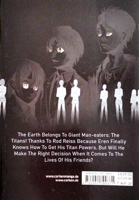 ESCAPE FROM KING TITAN: Thanks to Rod Reiss, Eren finally knows the terrible truth behind how he acquired his Titan powers, and the depth of his father's crimes. The king orders his daughter Historia to kill Eren and restore the power of the Titans to its rightful place, but she chooses her own selfish path: survival. As the cavern crumbles around the Survey Corps, Eren must make another last-minute decision, with the lives of all his friends in the balance.