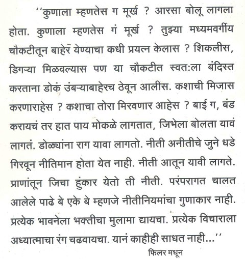 "कुणाला म्हणतेस ग मूर्ख ? आरसा बोलू लागला होता. कुणाला म्हणतेस गं मूर्ख ? तुझ्या मध्यमवर्गीय चौकटीतून बाहेर येण्याचा कधी प्रयत्न केलास ? शिकलीस, डीगऱ्या मिळवल्यास पण या चौकटीत स्वतः ला बंदिस्त करताना डोकं उंबऱ्याबाहेरच ठेवून आलीस. कशाची मिजास करणार आहेस ? कशाचा तोरा मिरवणार आहेस ? बाई गं बंड करायचं तर हात पाय मोकळे लागतात , जिभेला बोलता यावं लागतं. डोळ्यांना राग यावा लागतो. नीती अनीतीचे जुने धडे गिरवून नीतिमान होता येत नाही. नीती आतून यावी लागते. प्राणांतून जिचा हुंकार येतो ती नीती. परंपरागत चालत आलेले पाढे बे एके बे म्हणजे नितीनियामांचा गुणाकार नाही. प्रत्येक भावनेला भक्तीचा मुलामा द्यायचा. प्रत्येक विचाराला अध्यात्माचा रंग चढवायचा. यानं काहीही साधत नाही …" फिलर मधून