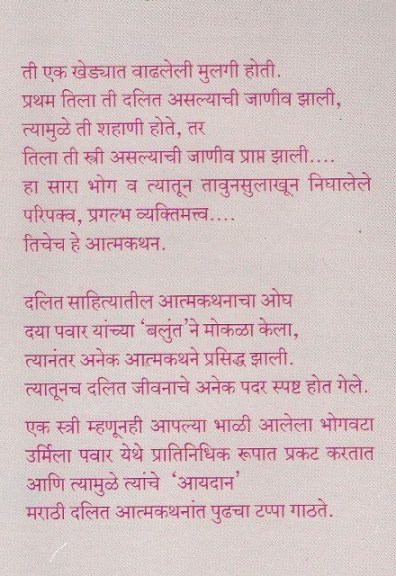 ती एक खेड्यात वाढलेली मुलगी होती. प्रथम तिला ती दलित असल्याची जाणीव झाली, त्यामुळे ती शहाणी होते, तर तिला ती स्त्री असल्याची जाणीव प्राप्त झाली...हा सारा भोग व त्यातून तावूनसुलाखून निघालेले परिपक्व, प्रगल्भ व्यक्तिमत्त्व... तिचेच हे आत्मकथन.